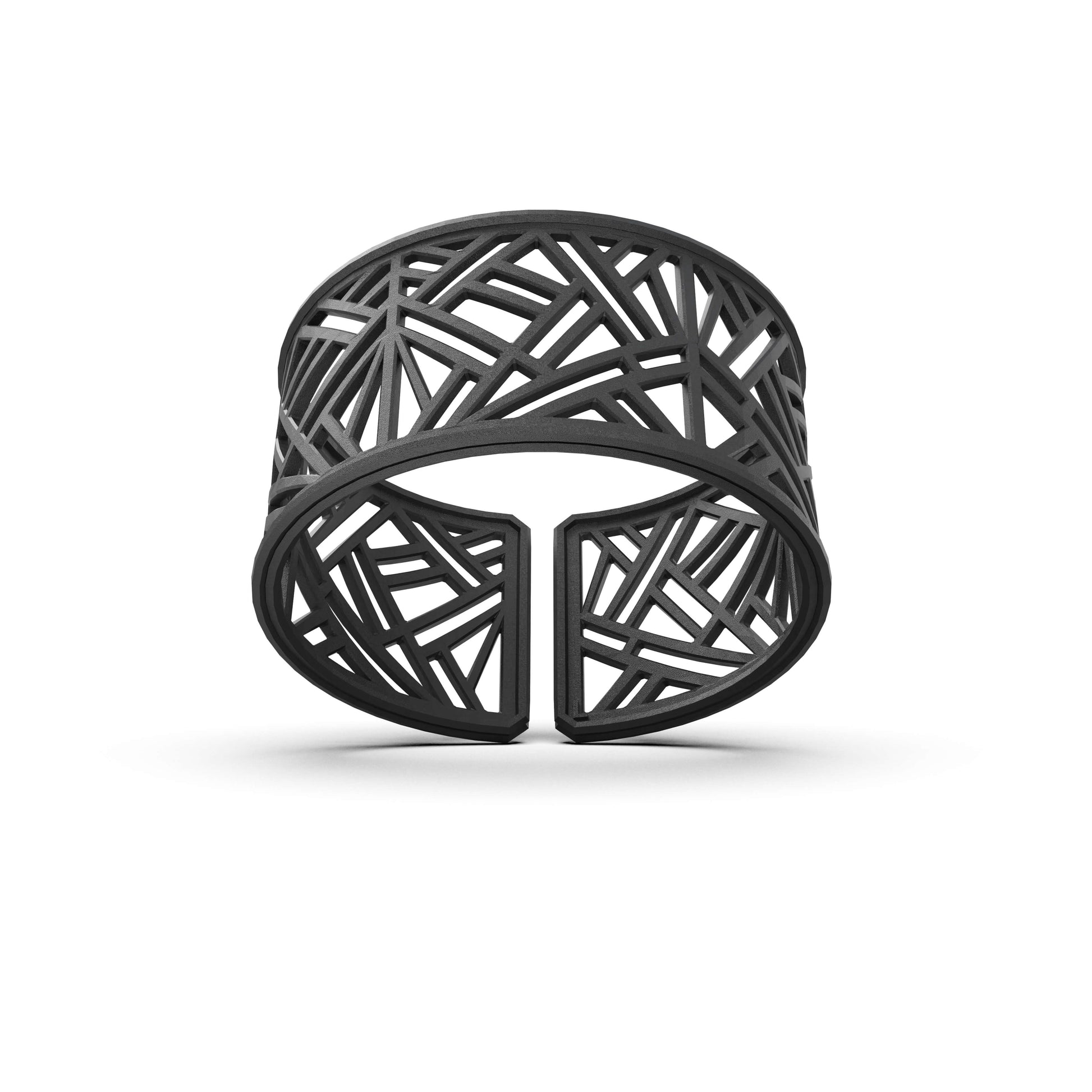 The lines blend into an architectural texture that caresses the wrist with graphic elegance .